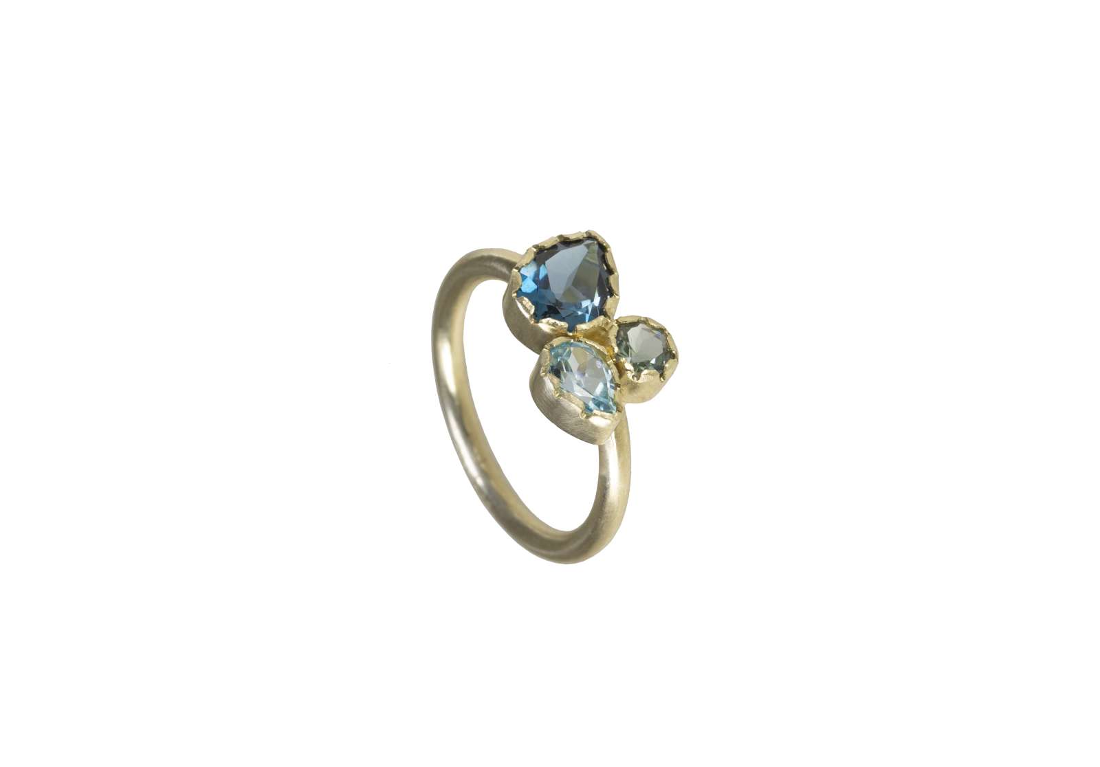 The topaz and the tourmaline mixed cut enclosed in the characteristic scalloped bezels, form the relief design and the name of the Dalia ring. Made in lost wax casting, it is modeled in satin 9 kt yellow gold and handcrafted by master goldsmiths in our workshop on Lake Como. The gems are the fulcrum of the jewel, and the setting is at the service leaving it all the space to be admired.