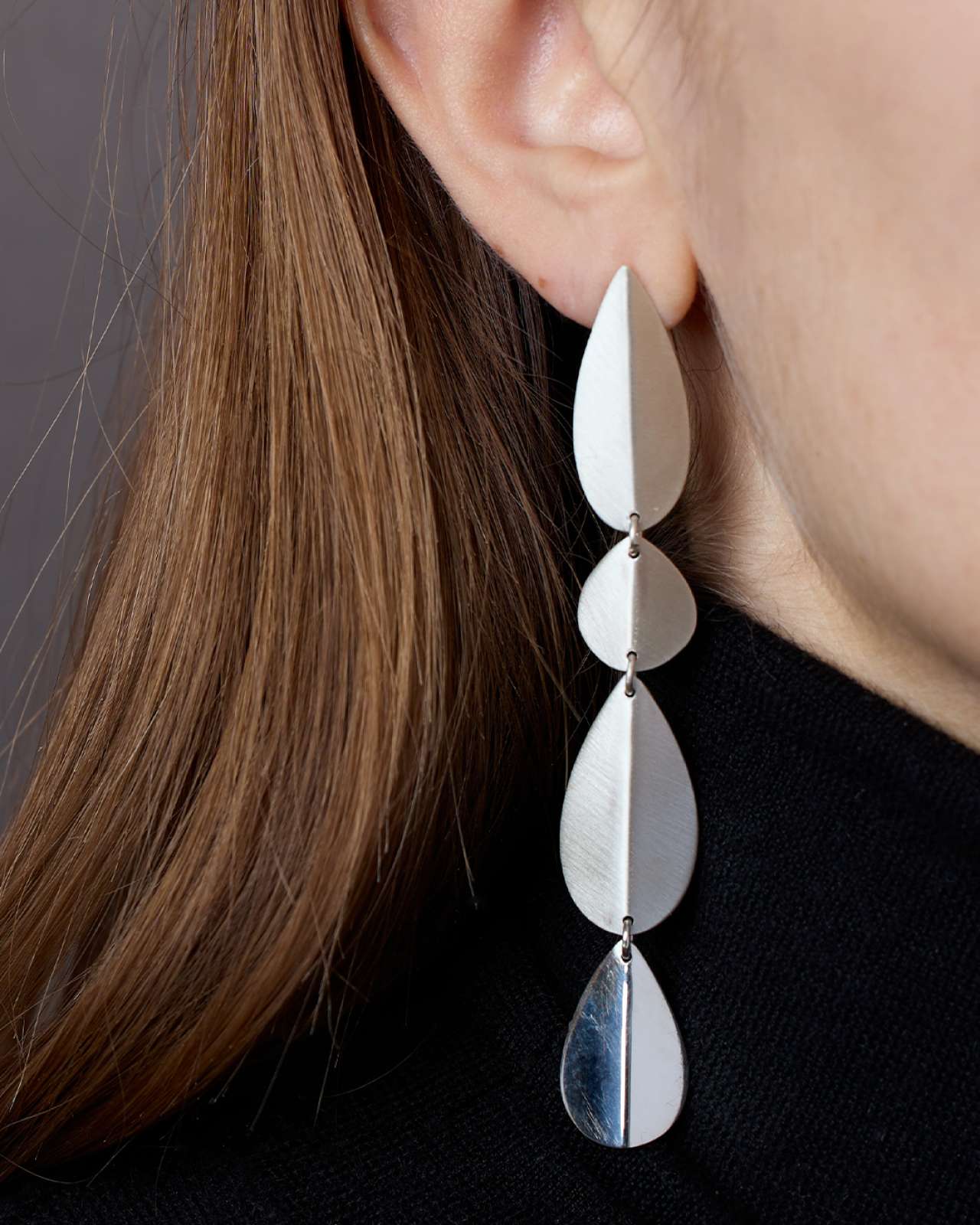 Leaves crafted from 925 sterling silver sheet, hand-cut and shaped by our master goldsmiths in our workshop overlooking Lake Como, form this distinctive pair of long stud earrings. Satin-finished except for the final leaf, which enhances their brightness, they bring light and movement to the face. Lightweight and elegant, they are perfect to wear on any occasion.